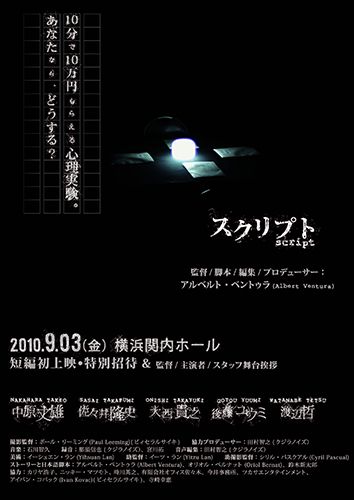 Miike, Shin, Masa and Yuri participate in an experiment for 100 thousand yen. They have been asked to stay in a dark room for 10 minutes, where there is nothing else than a table with a lamp and 4 envelopes marked with their names. From the moment they will open the envelopes and this apparently absurd situation will turn into an increasing suspense story. After all, this experiment was probably not that simple.